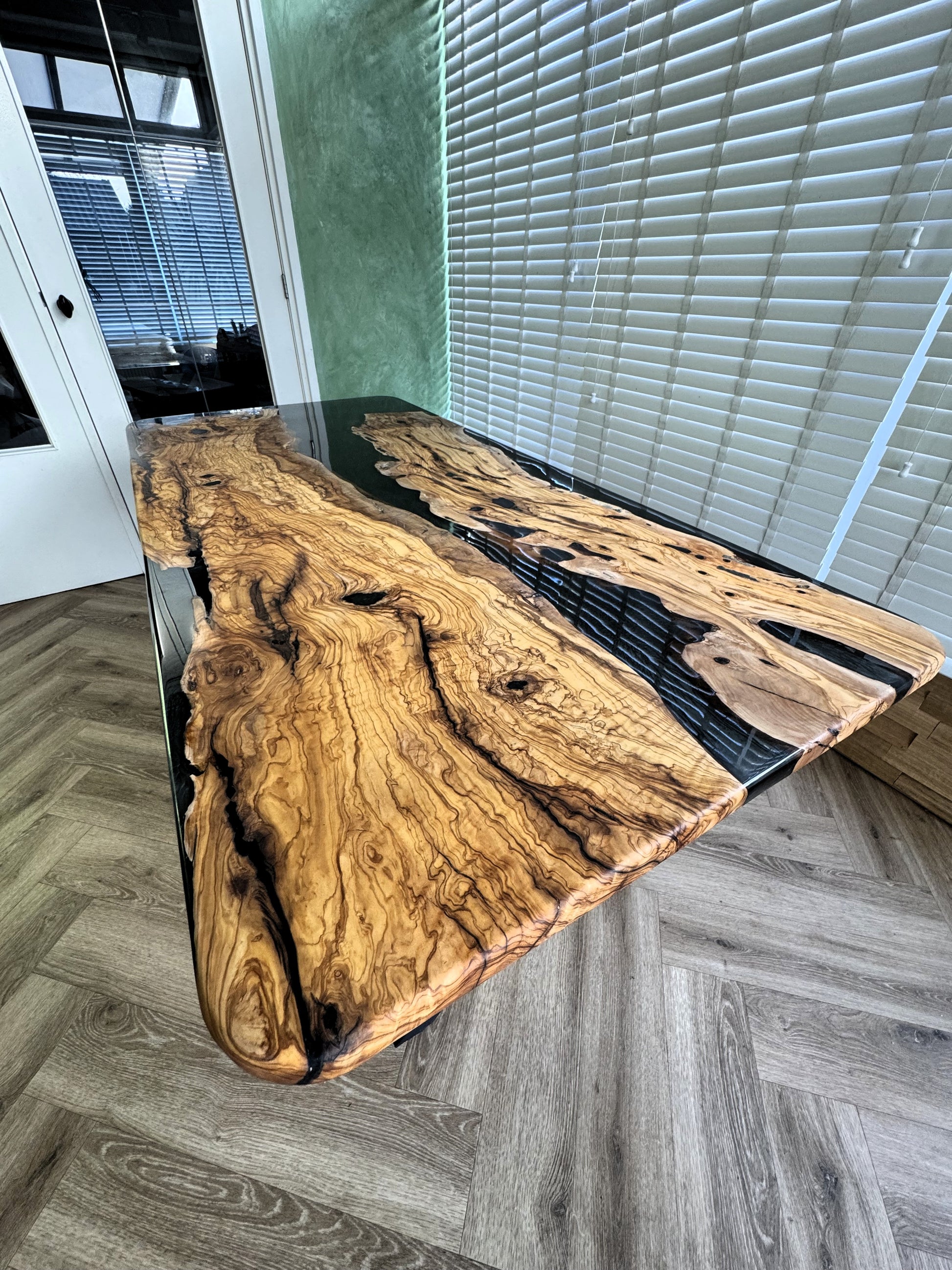 Geef jouw interieur een luxe en natuurlijke uitstraling met deze unieke epoxy eetkamertafel van olijfhout. Met zijn organische nerven en warme houttinten straalt deze tafel karakter en elegantie uit. De tafel is met de hand vervaardigd en voorzien van een hoogwaardige epoxy-afwerking, die niet alleen de schoonheid van het hout accentueert maar ook zorgt voor een duurzame, krasbestendige en waterafstotende laag.